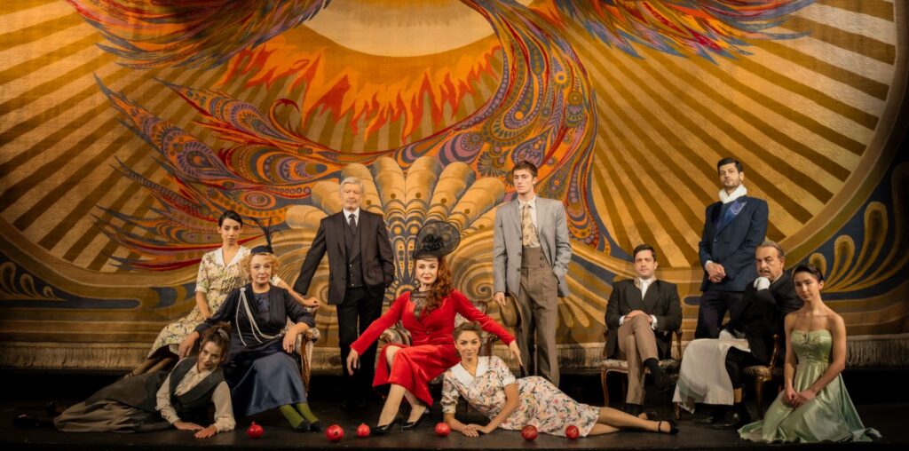 Както се подразбира, заглавието на пиесата е с двояко значение. Освен че е използван похватът „театър в театъра“ (за да надникне публиката в храма на Мелпомена, а също зад кулисите и в гримьорните), той е метафора на обществения маскарад, на лицемерието в човешките взаимоотношения изобщо. Свидетели сме на отблъкващо съперничество, интриги, прояви на грозно самолюбие – един истински „панаир на суетата“. Двуличието е белязало не само професионалните отношения, но и приятелските и семейните. В очите на Джулия съпругът ѝ (Ириней Константинов), собственик на проспериращ театър, където тя самата е голямата звезда, е „непочтен малък израстък“. По собственото му признание най-големият му талант е да печели пари, а именно те са основната движеща сила в света, който се разкрива пред зрителите. „Бляскавият стил на Съмърсет Моъм, отличаващ се с неочаквани сюжетни обрати, остроумие, проницателност и ирония, прави произведенията му истински пристрастяващи. Това в пълна сила важи и за „Театър“, казват още от екипа.
