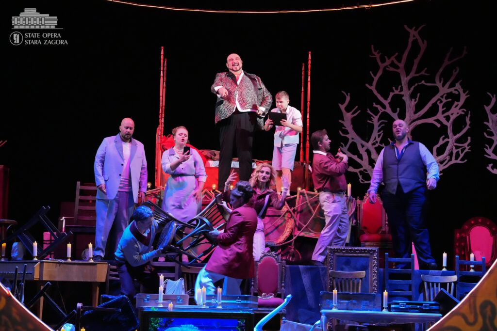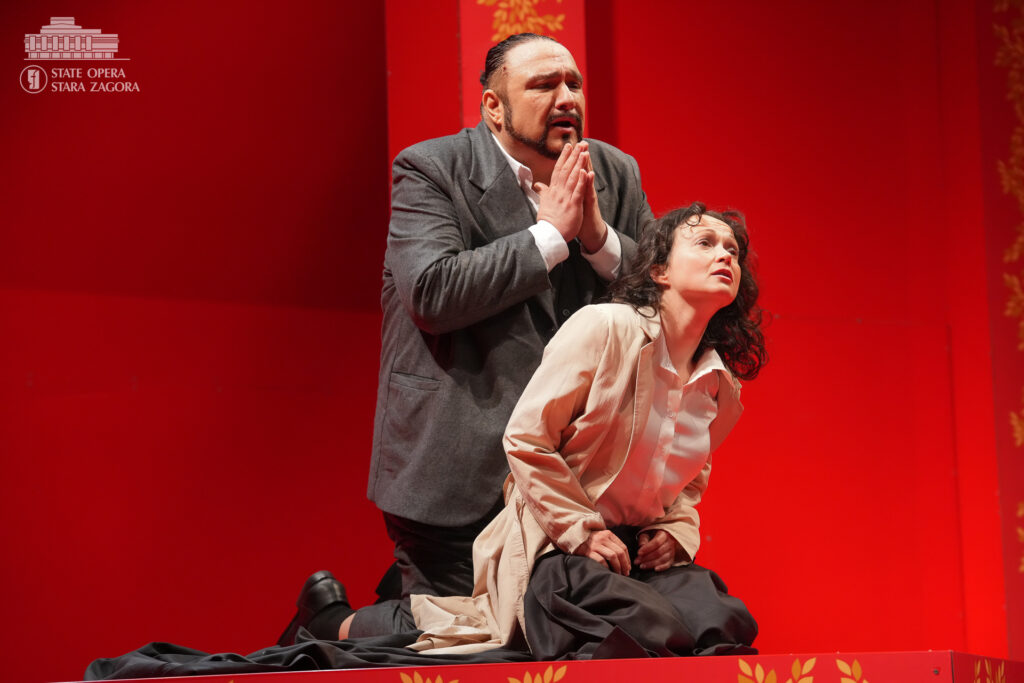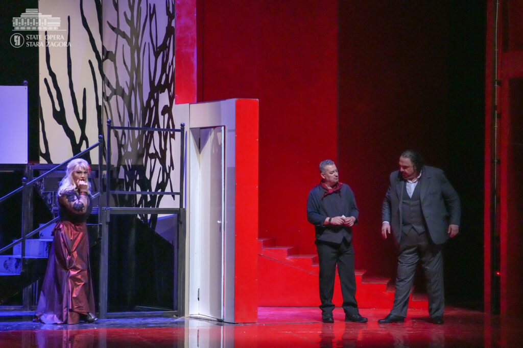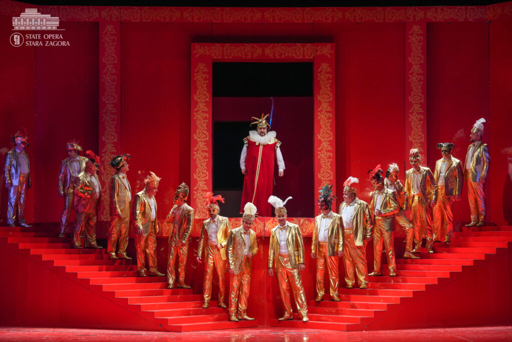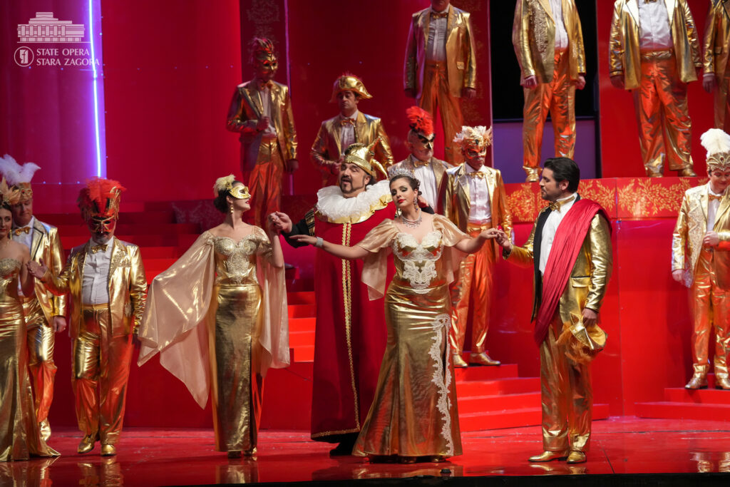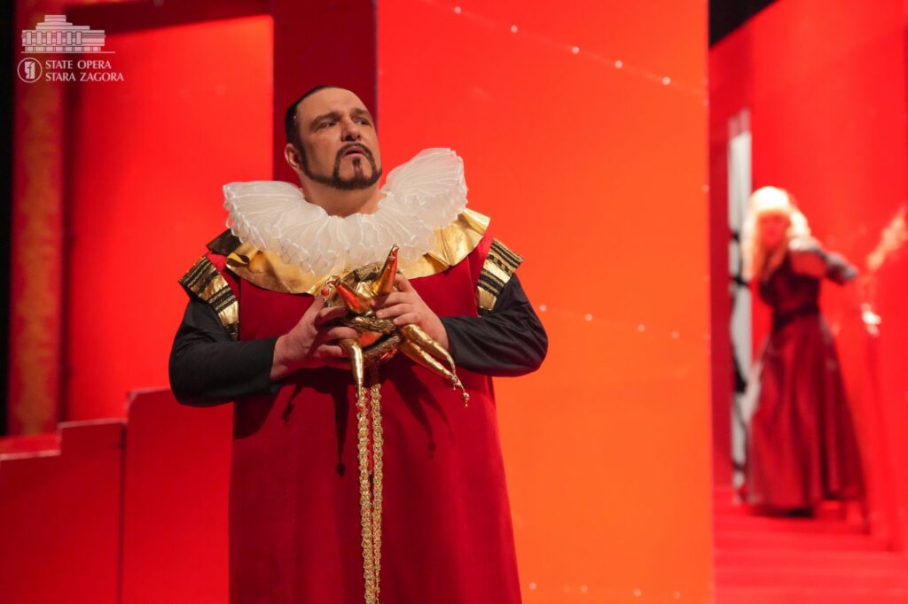 Първата сцена пренася зрителите в „царството на удоволствието“ – пищен замък, „крещящ“ в царствените позлата и пурпурночервено. Зъвръзката е проклятието, което се стоварва върху главата на хромия Риголето и което оставя у героя, а и у публиката усещането за надвиснало зло. Като придворен шут той си служи изкусно със словото и смеха, както други – с камата, в този случай обаче успява да си навлече гнева на граф Монтероне (Александър Марулев), който проклина ядно и него, и господаря му. От този момент нататък ставаме свидетели на съзаклятничества, дворцови интриги, коварни капани, отвличане, убийство, но също и на сцени на нежност, любов, саможертвеност. В образа на Джилда, дъщерята на Риголето, която той крие от всички и която хората от обкръжението му се заблуждават, че е негова любовница, гледаме Емилия Терзиева. Рейналдо Дроз е херцогът на Мантуа, Стоян Буюклиев – Борса. Участват хор и оркестър на Държавна опера – Стара Загора. Хормайстори са Младен Станев и Стефания Русева, концертмайстор – Паулина Захариева.